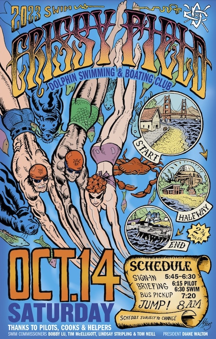 Crissy Field is one of the longest swims of the Dolphin Club swim program, similar distance to the Bay Bridge swim, and one mile less than Fort Point. In 2023 Crissy Field was the longest swim because Fort Point was canceled. Crissy Field is a challenging swim due to the back eddy which forms along the western end near the starting point. Recent past years have used a boat start, attempting to avoid the back eddy, but in 2023 the swim returned to a beach start following a bus trip. This poster highlights scenic landmarks along the swim, from the starting point near the "Warming Hut" at the west end, to the midpoint at the east end of Crissy Field marked by Palace of fine arts, and ending with the Dolphin clubhouse seen in the distance behind the currently crumbling Muni Pier. The Dolphin Swimming & Boating Club, in San Francisco since 1877.