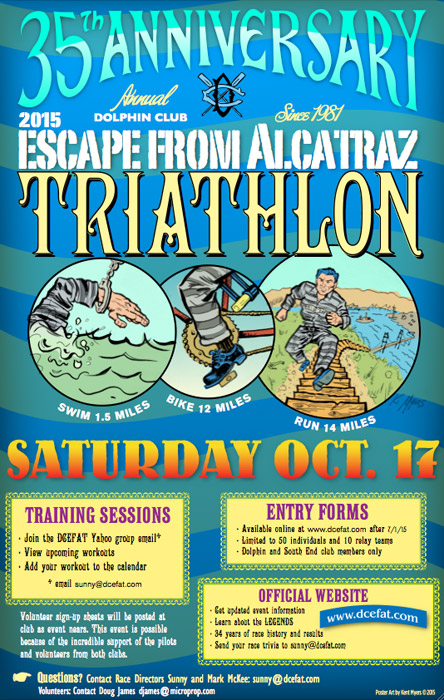 Official Dolphin Club poster for the 35th anniversary of the original Escape From Alcatraz Triathlon. A Dolphin Club event since 1981, the event is now organized by Sunny & Mark McKee, and has inspired many other unaffiliated so-called Alcatraz triathlons drawing atheletes from around the world. Sunny directed the design of this poster to emphasize the relative difficulties of the event, with the running portion the most challenging. The Dolphin Swimming & Boating Club, in San Francisco since 1877.