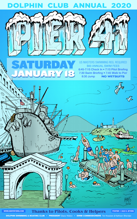 Pier 41 is the first swim of the year each January. As it's usually the coldest time of year, this swim is also the shortest at one mile. The lettering style for this poster reflects the chilly winter water tempertures which have dipped into the upper 40's (°F) in years past yet fail to deter our hardy swimmers. The Dolphin Swimming & Boating Club, in San Francisco since 1877.