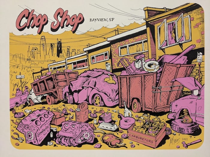 Chop Shop is a pandemic-era drawing by Kent Myers about the growing homelessness crisis in San Francisco. Our neighborhood filled up with people living in their vans right when covid lockdown began and the encampment grew to more than 100 vehicles. The city created an official VTC in the area to hold vehicle-dwelling families, and as the camp was cleared out, this chop shop moved in. They stayed for about a month and at night, driving home, it would be bright as day with the whole street lite up by industrial lamps, and a crew of workers breaking down and sorting all types of mechanical equipment. Cars were cannibalized out in the open, while the daily news focused on covid and getting your catalytic converter slolen. Pretty weird. Out of towners were constantly victims of smash & grabs which suddenly seemed legal. It was like living in a Mad Max movie.